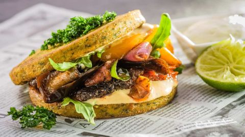 Ein wirklich saftiger, liebevoll kreierter Veganer Burger, mit viel gegrilltem Gemüse und einer leckeren veganen Würz-Mayonnaise.