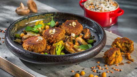Diese deftig-lecken Erbsenbällchen werden mit feinem Gemüse und einer schönen Pilzsauce serviert.