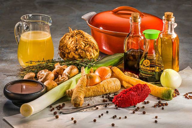 Möhren, Sellerie, Lauch, Zwiebeln, Pilze und Petersilienwurzeln waschen und samt Schale würfeln. Rapsöl erhitzen und das Gemüse sowie Pilze hinzufügen. Kräftig anrösten und mit Tomatenmark tomatisieren. Rohzucker hinzufügen und leicht karamellisieren. Mit Johannisbeersaft und Gemüsefond ablöschen. Gewürze und Kräuter dazugeben und mit geschlossenem Deckel bei kleiner Hitze weich köcheln. Sojasauce und Marmite dazugeben und weitere 10 Minuten weiterkochen. Anschließend durch ein feines Sieb in einen anderen Topf passieren. Kichererbsenmehl mit dunklem Balsamicoessig und Wasser glatt- und in die passierte Sauce einrühren. Je nach gewünschter Konsistenz entsprechend die Menge der Bindung variieren. Sauce gut durchkochen und eventuell nochmals durch ein Passiertuch durchlassen.