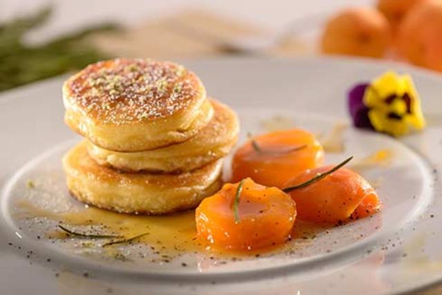 Die frisch gebackenen Pancakes auf dem Teller anrichten und mit Rosmarin-Salz bestreuen. Die eingekochten Aprikosen ringsherum auf dem Teller verteilen. Die Pancakes noch mit Puderzucker anstäuben und mit Pfeffer-Cuvée verfeinern. Nach Belieben mit essbaren Blüten dekorieren.