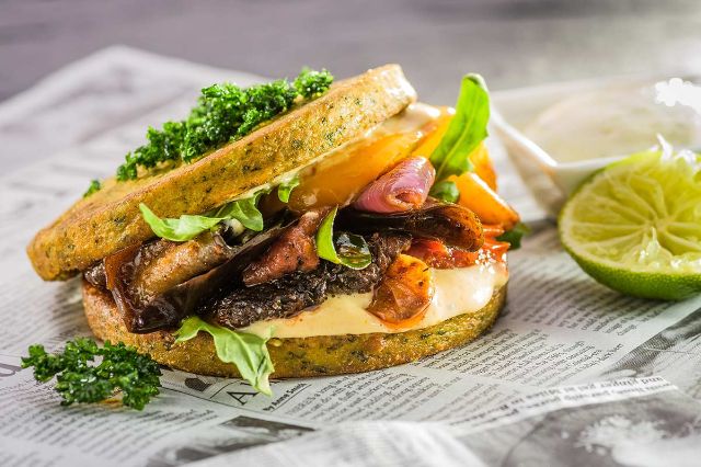 Ein wirklich saftiger, liebevoll kreierter Veganer Burger, mit viel gegrilltem Gemüse und einer leckeren veganen Würz-Mayonnaise.