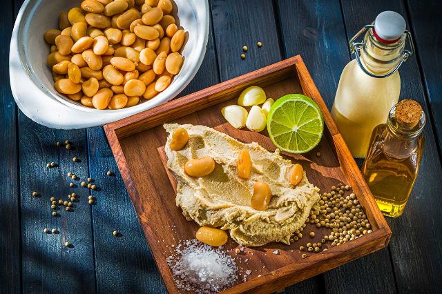 Bohnen auf einem Sieb abseihen und mit Knoblauch, Olivenöl, Limettensaft und hausgemachter "Veganer Milch" in einem Cutter glatt pürieren. Mit Salz und Pfeffer abschmecken.